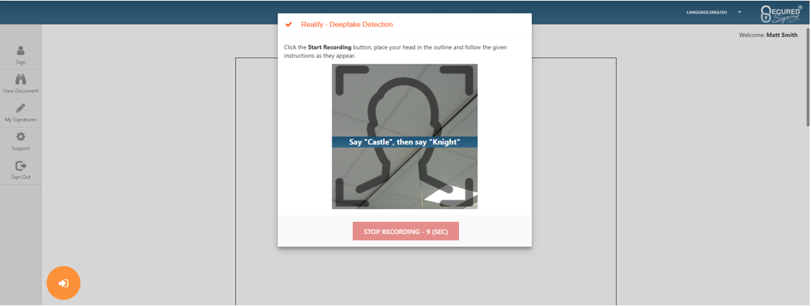 The Deekfake Test is automatically started. It is important your head is positioned within the outline and you speak the two words in the prompt. E.g. Castle, Knight.